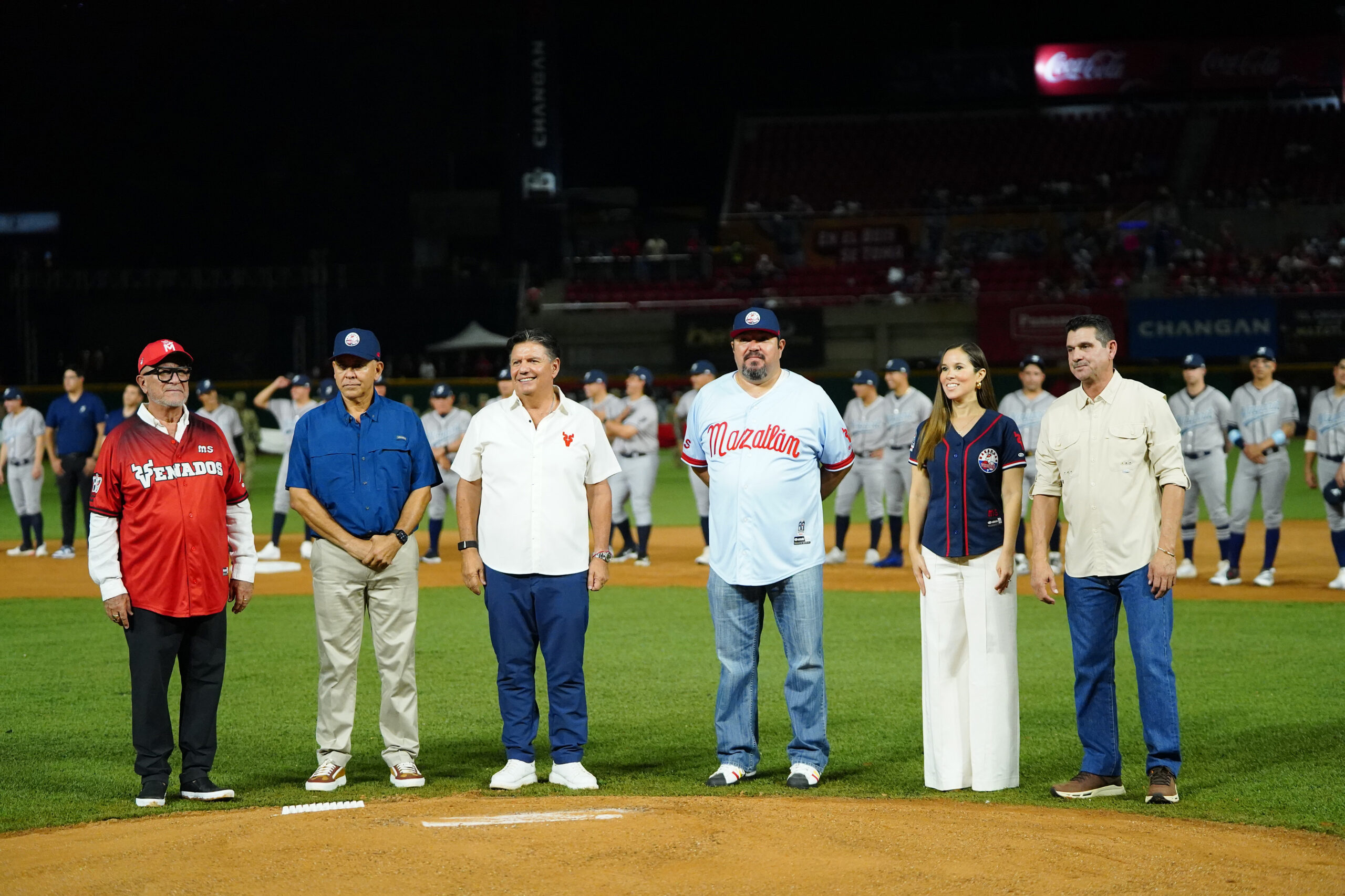 Con los jugadores de Venados de Mazatlán y Jaguares de Nayarit, así como las autoridades en el centro, se realizaron los honores con el apoyo de la Bandera Monumental de la Tercera Región Militar.